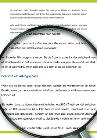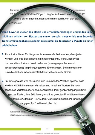 - Wie Sie durch Ihre Transformationsphase sehr reizvoll-souverän aus Ihrem längst aussichtslos gewordenen Ergebenheit-Modus wieder aussteigen und ihn genau DADURCH wieder das Band zwischen Ihnen spüren lassen