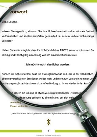 Sie bekommen ausschließlich den Gratis-Report im PDF-Format zugesandt sowie im Anschluss meinen kostenlosen Newsletter mit weiteren, nützlichen Tipps zu den Themen „Beziehung“ und „Er distanziert sich“. Sie können sich selbstverständlich jederzeit wieder von meinem Newsletter abmelden. Jede Email enthält einen Abmelde-Link, über den Sie sich mit einem Mausklick wieder aus dem System austragen können.